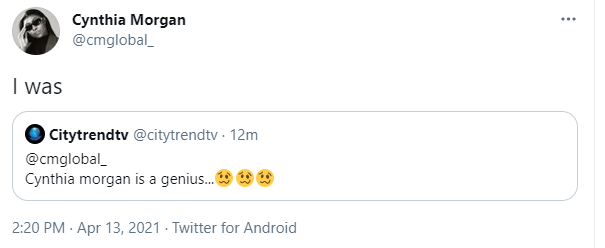 Cynthia Morgan has dismissed the opinion of one of her followers on Twitter who described her as a genius.
